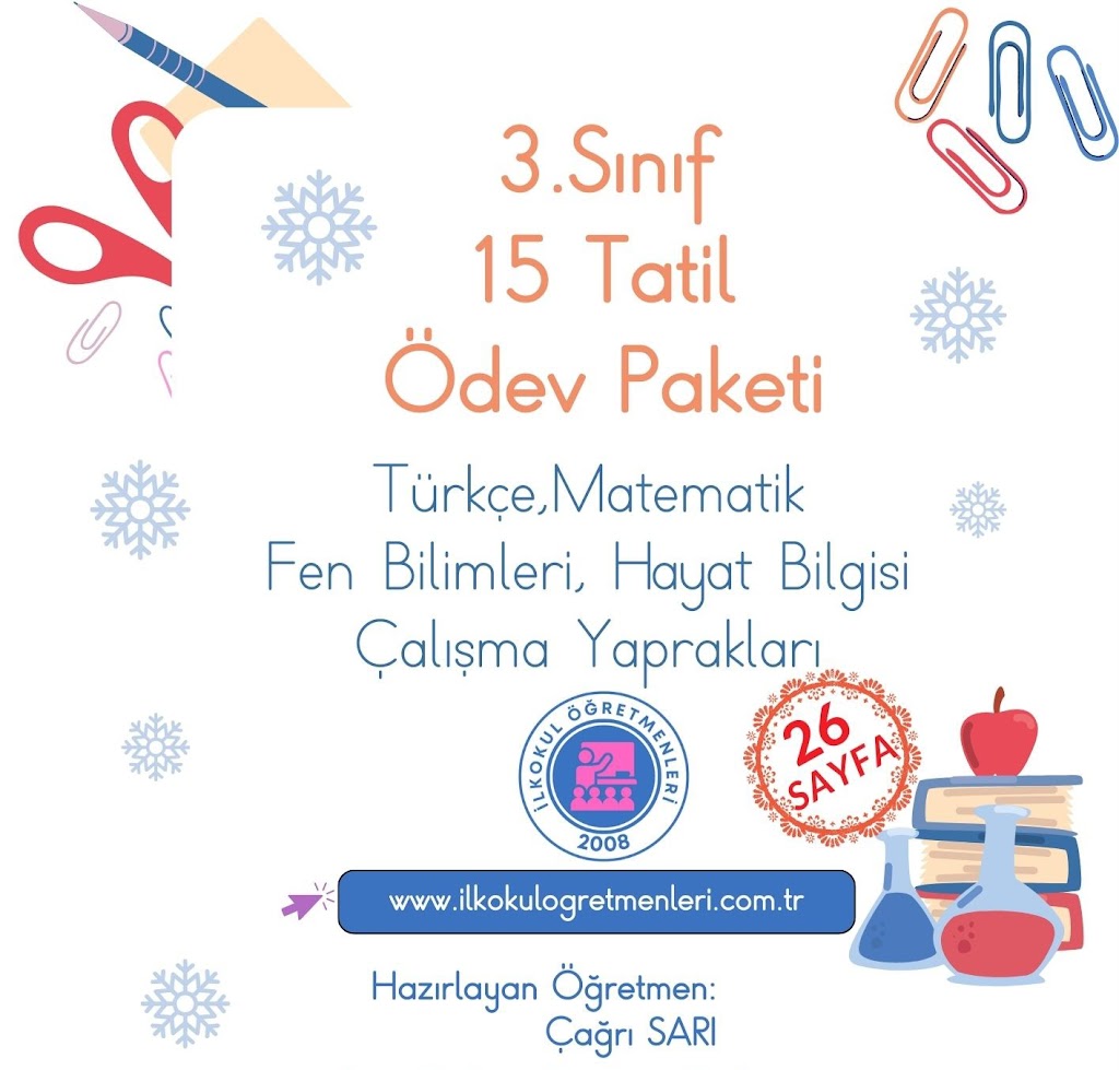 3.sınıflar için 15 tatil ödev paketimiz öğrencilerimizin hem eğlenceli vakit geçirmesine hem de öğrendiklerini tekrar etmesi için hazırlanmıştır. Uzun zaman harcanarak ve büyük emekler verilerek hazırladığımız ödevlerimizin devamı için lütfen beğeni ve yorumlarınızı eksik etmeyin.